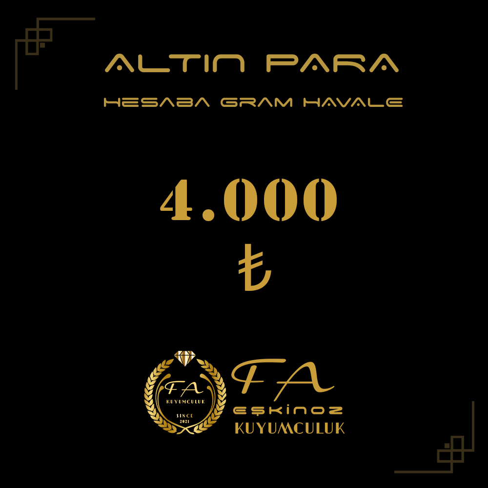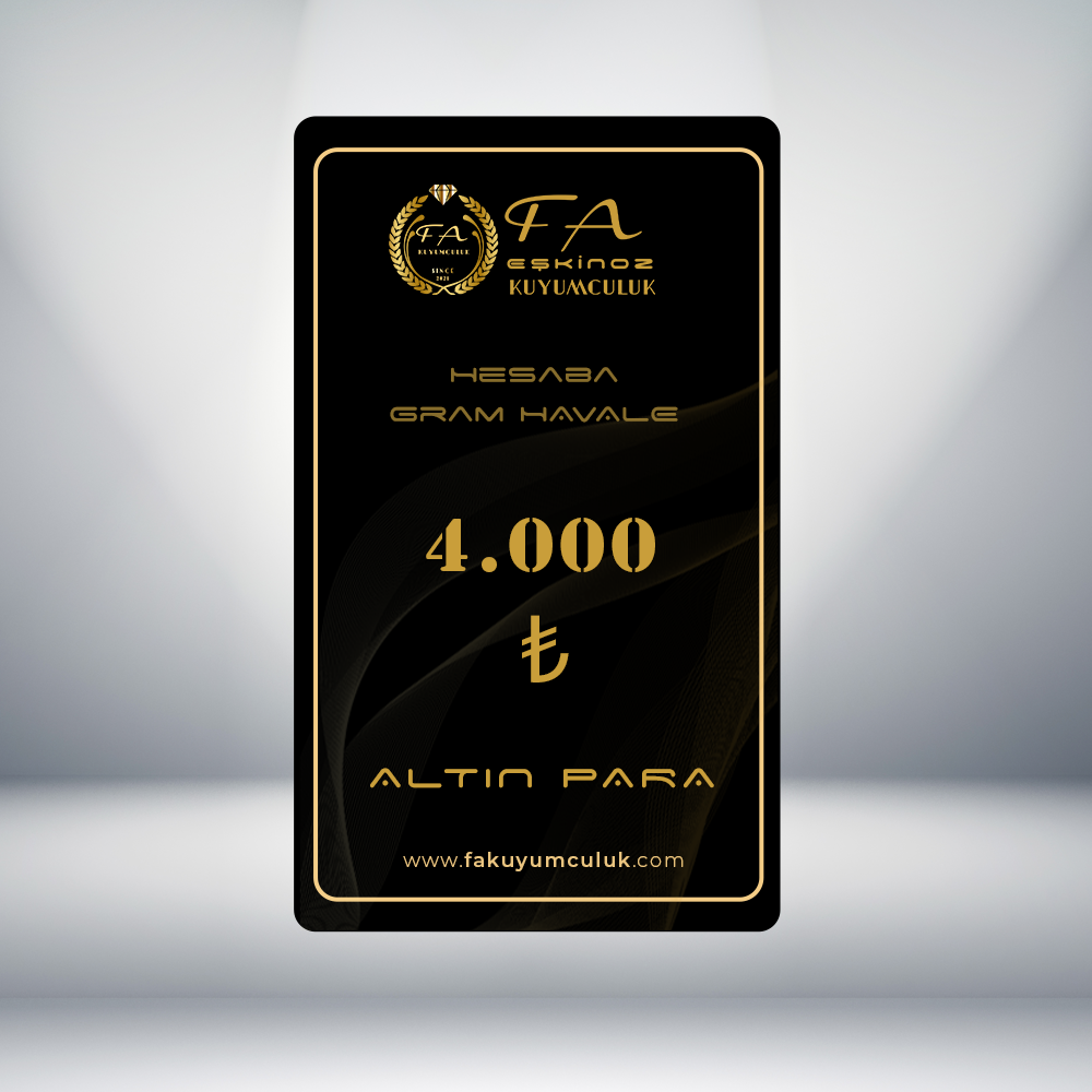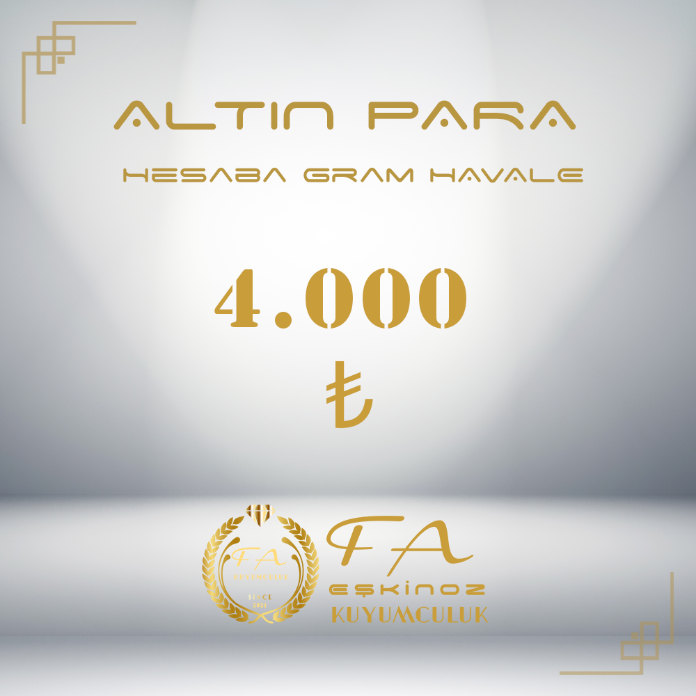 Altın Para : Nakitve Kredi Kartınız ile Altın Hesabınıza yapılan altın transfer işlemidir. Dilediğiniz TL miktarında Karşılık gelen tutarda hesabınıza Gram altın Transferi yapılmaktadır. Dilerseniz Hesabınız yerine fiziki olarak da mağazamızdan karşılık gelen gram altını teslim alabilirsiniz.
