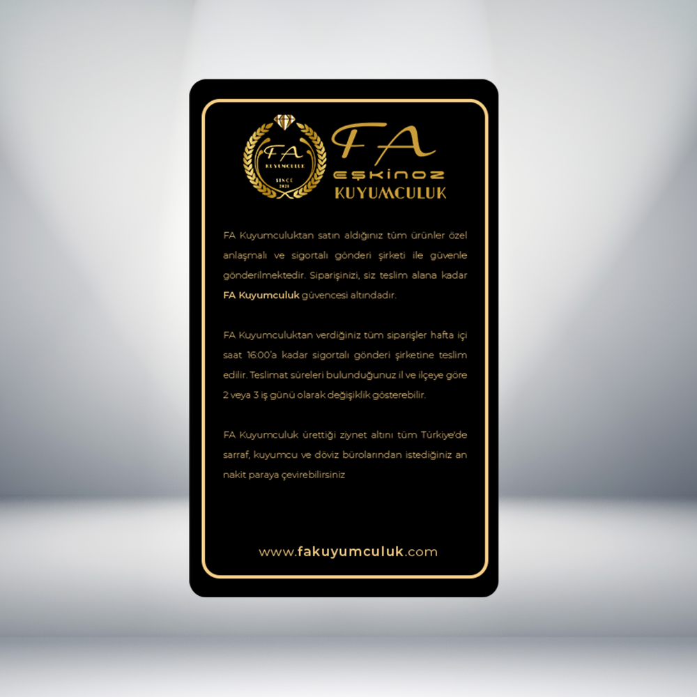 Fa Kuyumculuk internet sitemizden vermiş olduğunuz siparişlerinizi özenle paketliyor ve adresinize sigortalı gönderim firmasıyla ulaştırıyoruz. Hafta içi saat 16.00'a kadar verdiğiniz siparişleriniz, aynı gün sigortalı gönderim firmasına teslim edilir. Resmi tatil, cumartesi ve pazar günlerinde verilen siparişler ilk iş günü işleme alınmaktadır. Teslimat süreleri bulunduğunuz il ve ilçeye göre 2 veya 3 iş günü olarak değişiklik gösterebilir.